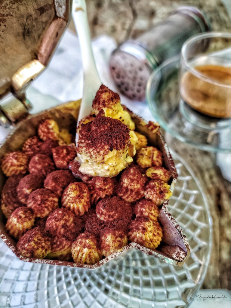 Procedimento: in planetaria con frusta o in una ciotola capiente con le fruste elettriche mettere lo zucchero, i tuorli, i semi di vaniglia e montare finchè diventano spumosi. Aggiungere il mascarpone e continuare a montare fino a quando il mascarpone si è incorporato bene alla massa di uova e zucchero. A questo punto ci sono due possibilità: se vi piace una consistenza molto densa e corposa il mascarpone è pronto. Se invece lo volete più soffice e meno denso, montate due/tre albumi a neve ben ferma e aggiungere mescolando delicatamente con una spatola dall’alto verso il basso. A questo punto il gioco è fatto. In una terrina rettangolare abbastanza capiente, cominciate a mettere uno strato di biscotti imbevuti nel caffè, io mi aiuto con due cucchiaini, dopodichè mettere uno strato di mascarpone,( circa mezzo centimetro) o semplicemente col cucchiaio o spatola, oppure se vi piace potete utilizzare la sac à poche. Continuate così fino a riempire la terrina ultimando con una generosa spolverata di cacao amaro. Far riposare in frigorifero per 2/3 ore, oppure potete metterlo in congelatore e tirarlo fuori almeno un paio d’ore prima di servirlo. Regolatevi anche in base alla temperatura esterna.