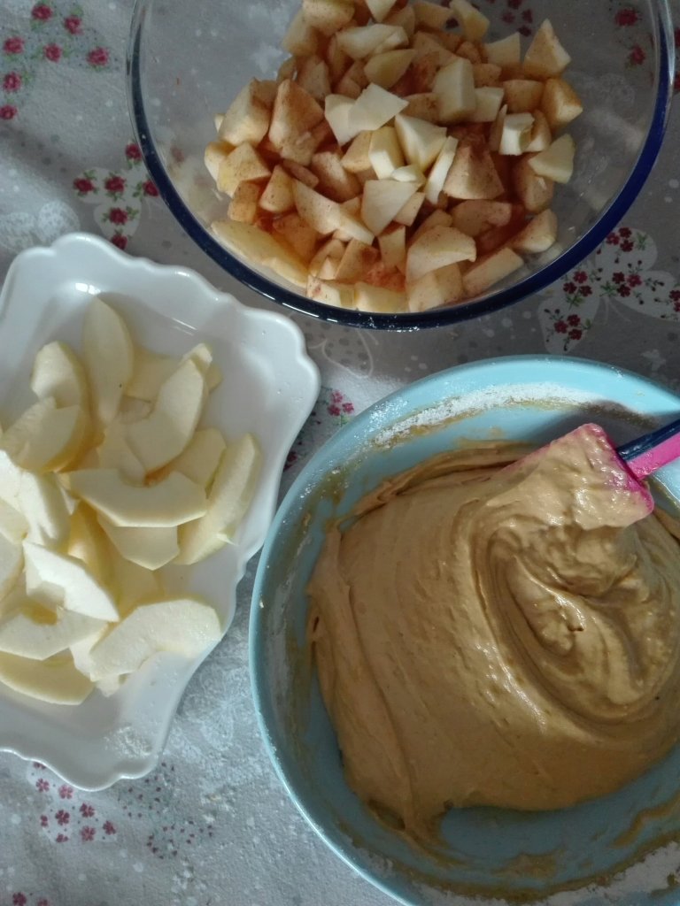 Tagliare a cubotti 3 delle 4 mele, aggiungere la cannella e lasciare da parte. Sciogliere il burro ( io nel microonde per 30-40 secondi) e mettere da parte. In una ciotola capiente mescolare lo zucchero con un uovo per volta, poi aggiungere il burro fuso, la scorza grattuggiata del limone e il pizzico di sale. Setacciare la farina ed aggiungerla poco per volta. A questo punto se l’impasto dovesse essere troppo duro, aggiungere un po’ di latte, poco per volta fino ad ottenere un impasto più cremoso. Aggiungere la bustina di lievito setacciata e le mele tagliate precedentemente. A questo punto accendere il forno (statico) a 180°.