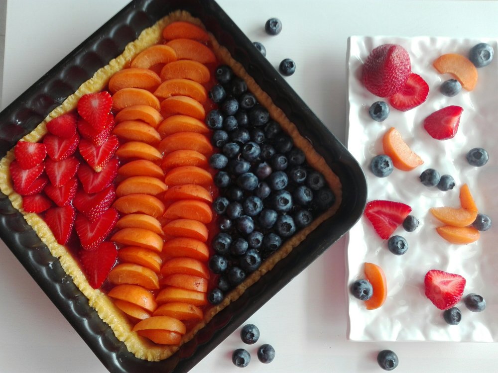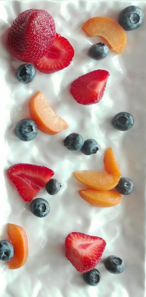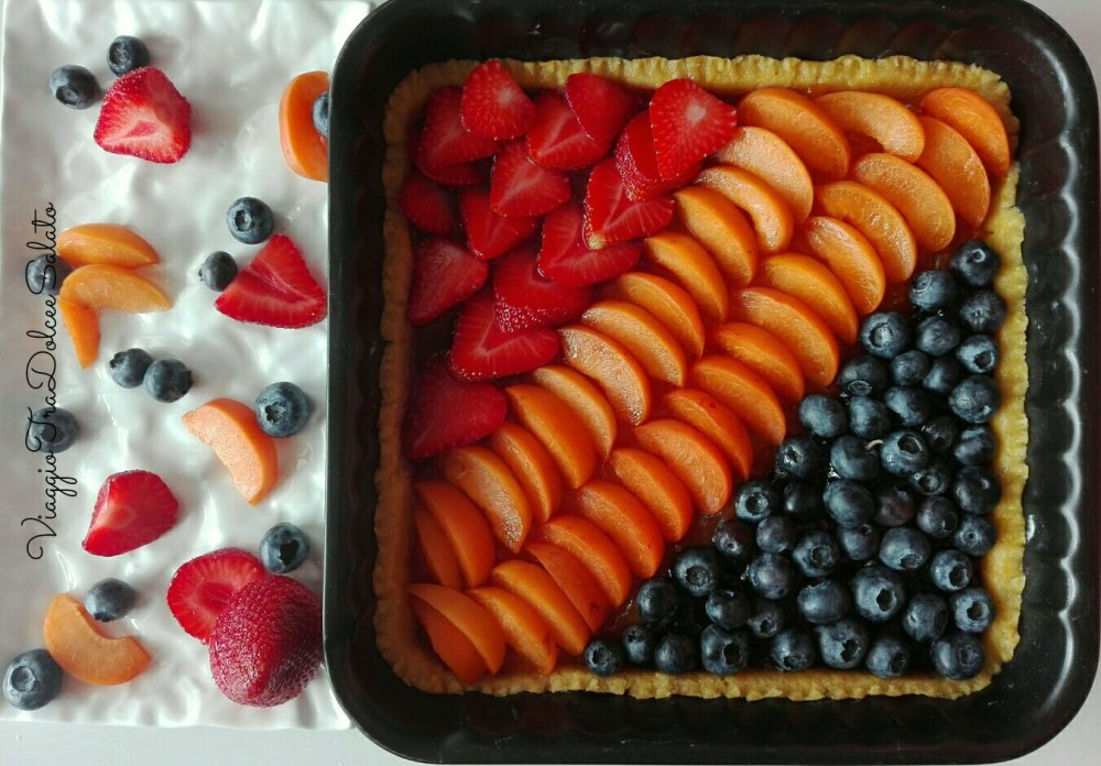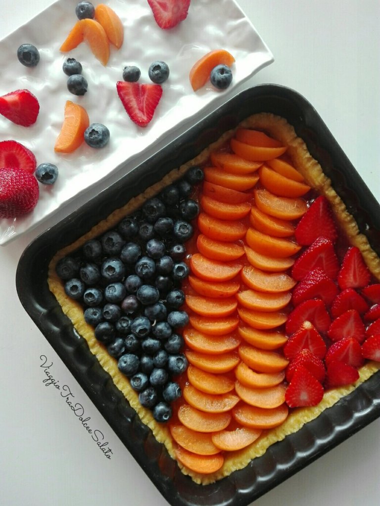 A questo punto accendere il forno a 180° e incominciare a pulire e tagliare la frutta. Ho preso dei mirtilli, delle fragole e delle albicocche fresche. Poi il taglio che volete dare alla torta lo decidete voi in base alla vostra creatività.