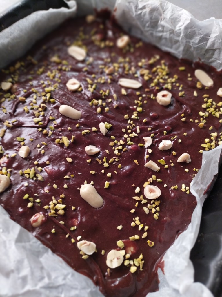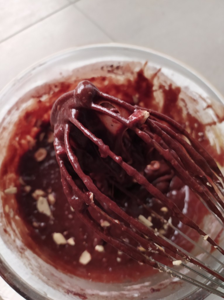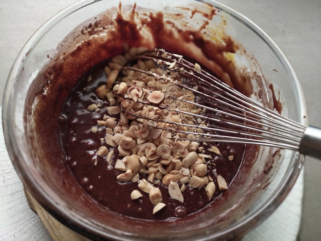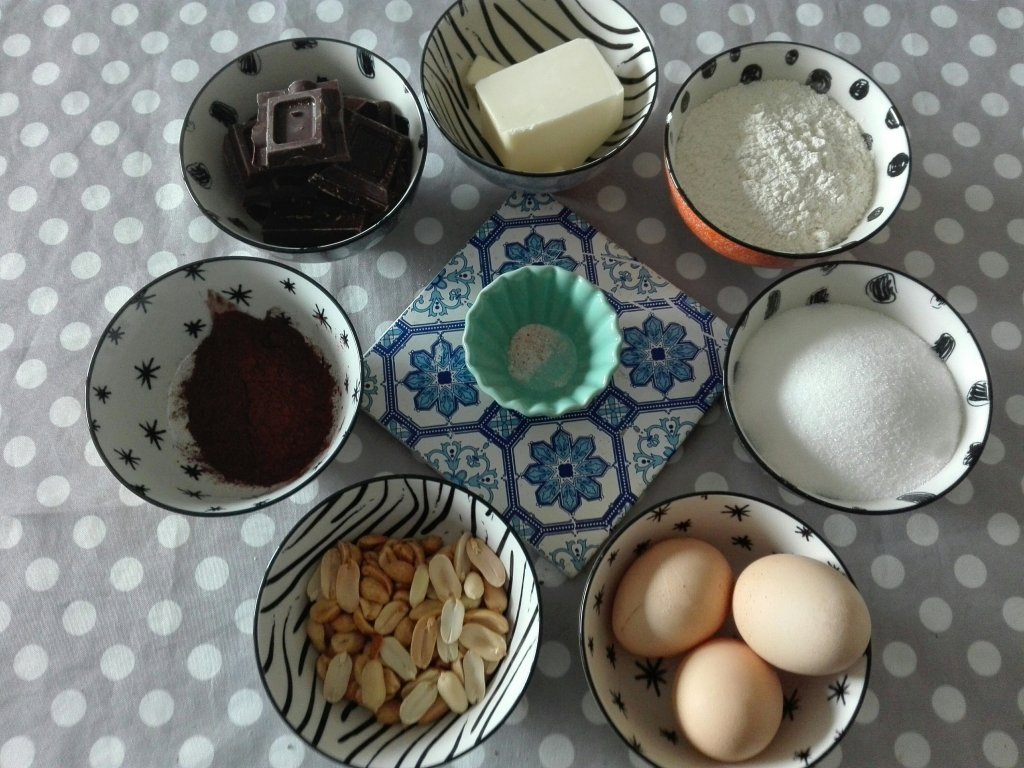 Sciogliere il cioccolato fondente leggermente sminuzzato nel microonde ad intervalli di 30 secondi mescolando ogni volta. Sciogliere anche il burro sempre nel microonde. In una ciotola mescolare con una frusta a mano le uova intere una per volta insieme allo zucchero, aggiungere il burro e il cioccolato dopo averli fatti leggermente raffreddare. Setacciare farina e cacao amaro insieme, aggiungere il pizzico di sale e per ultime le arachidi o le nocciole o entrambe dopo averle tagliate grossolanamente. Potete tenerne alcune da parte e metterle in superficie. Foderare con carta forno uno stampo quadrato 20×20 cm e infornare a 180° per 35/40 minuti circa (fate la prova dello stecchino).
