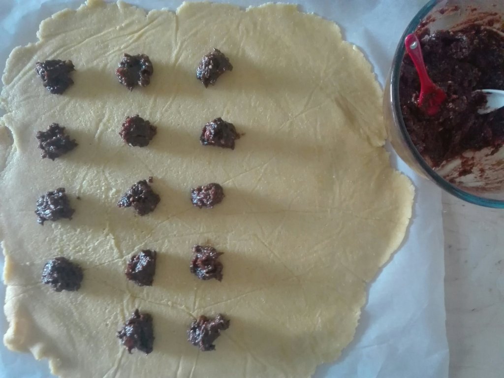 A questo punto stendere la pasta frolla tra due fogli di carta forno fino allo spessore desiderato. Io l’ho tirata abbastanza sottile, i primi ravioli sono venuti un po’ più spessi e gli altri un po’ più sottili. Questo è dovuto al fatto che tutti i ritagli di pasta vengono rimpastati e lo spessore ogni volta non è proprio identico al primo. Mettere un cucchiaino di ripieno. Se la frolla si scalda troppo vi consiglio di metterla qualche minuto in freezer, sarà più facile lavorarla.