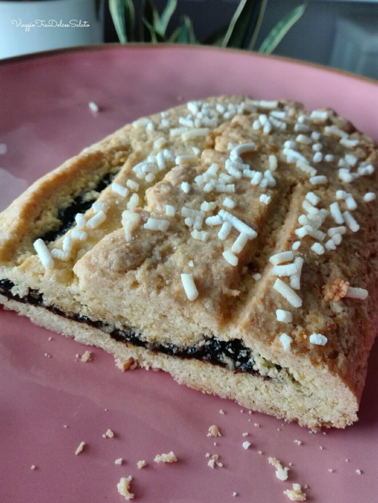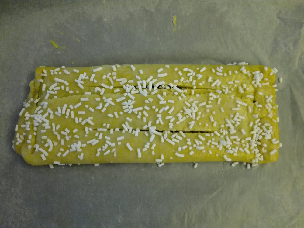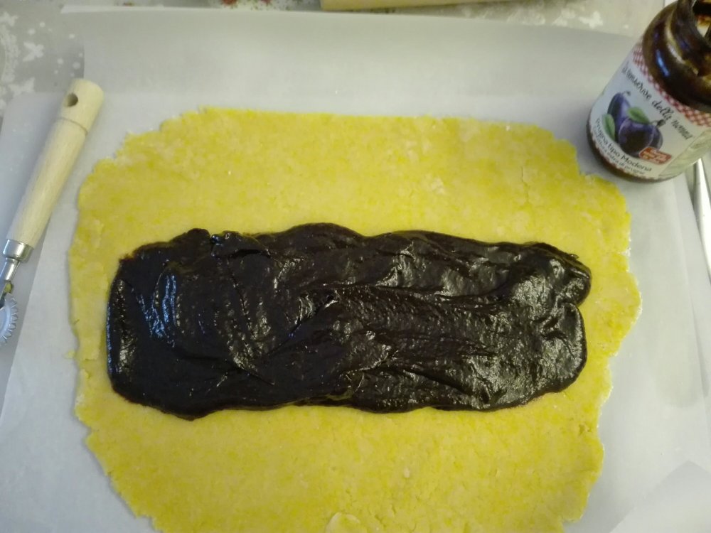 Stendere la pasta col mattarello tra due fogli di carta forno fino a formare un rettangolo alto circa 3/4 mm. A questo punto mettere al centro la confettura di prugne o quella che preferite lasciando almeno 1 cm libero e richiudere prima un lato lungo poi l’altro leggermente sovrapposto (come si fa col lo strudel). Chiudere anche le estremità in modo che la confettura non esca. Fare due tagli al centro col coltello per favorire la lievitazione, pennellare con il latte tutta la superficie e cospargere con granella di zucchero.