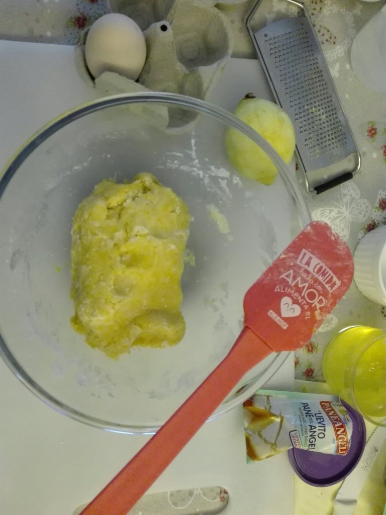 Per prima cosa accendere il forno a 180°. In una terrina setacciare fecola e farina, aggiungere lo zucchero, l’uovo intero e un tuorlo, il burro ammorbidito, la scorza di limone, il pizzico di sale e per ultimo il lievito setacciato. Mescolare con un cucchiaio poi proseguire con le mani, fino ad ottenere un panetto abbastanza compatto.
