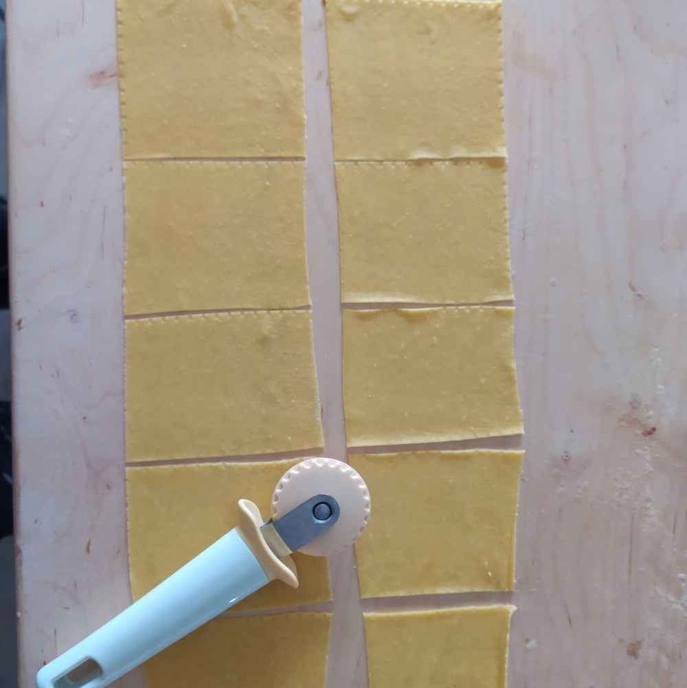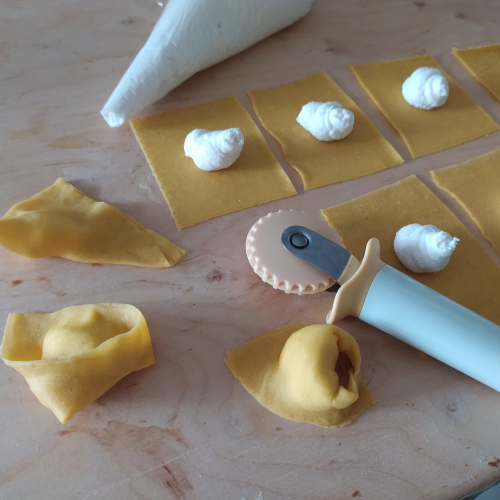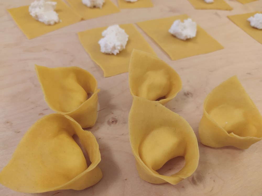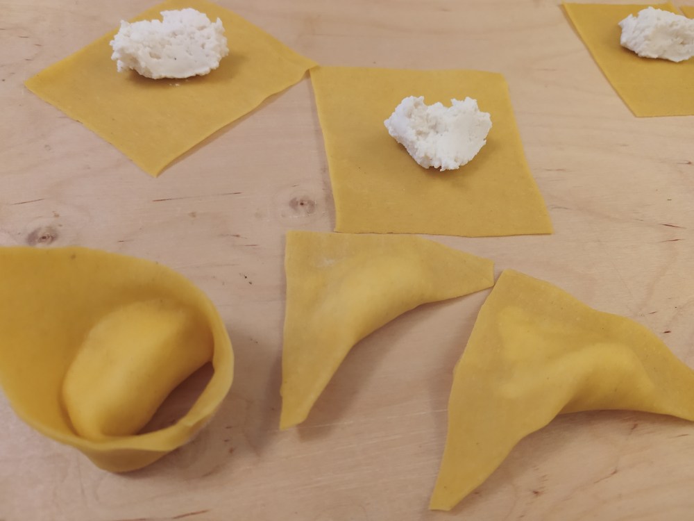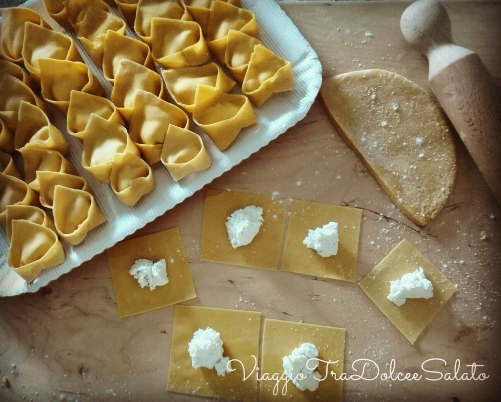 Una volta stesa la pasta poco per volta per non farla asciugare eccessivamente, mettiamo su ogni quadratino un po’ di ripieno. Chiudere a formare un triangolo e poi unire i due lati lunghi sigillandoli bene tra loro come si fa per i cappelletti. Se la pasta si fosse asciugata troppo potete bagnare leggermente i bordi con acqua. Questo dipende dalla stagione in cui si preparano, d’inverno si asciuga meno velocemente che d’estate.