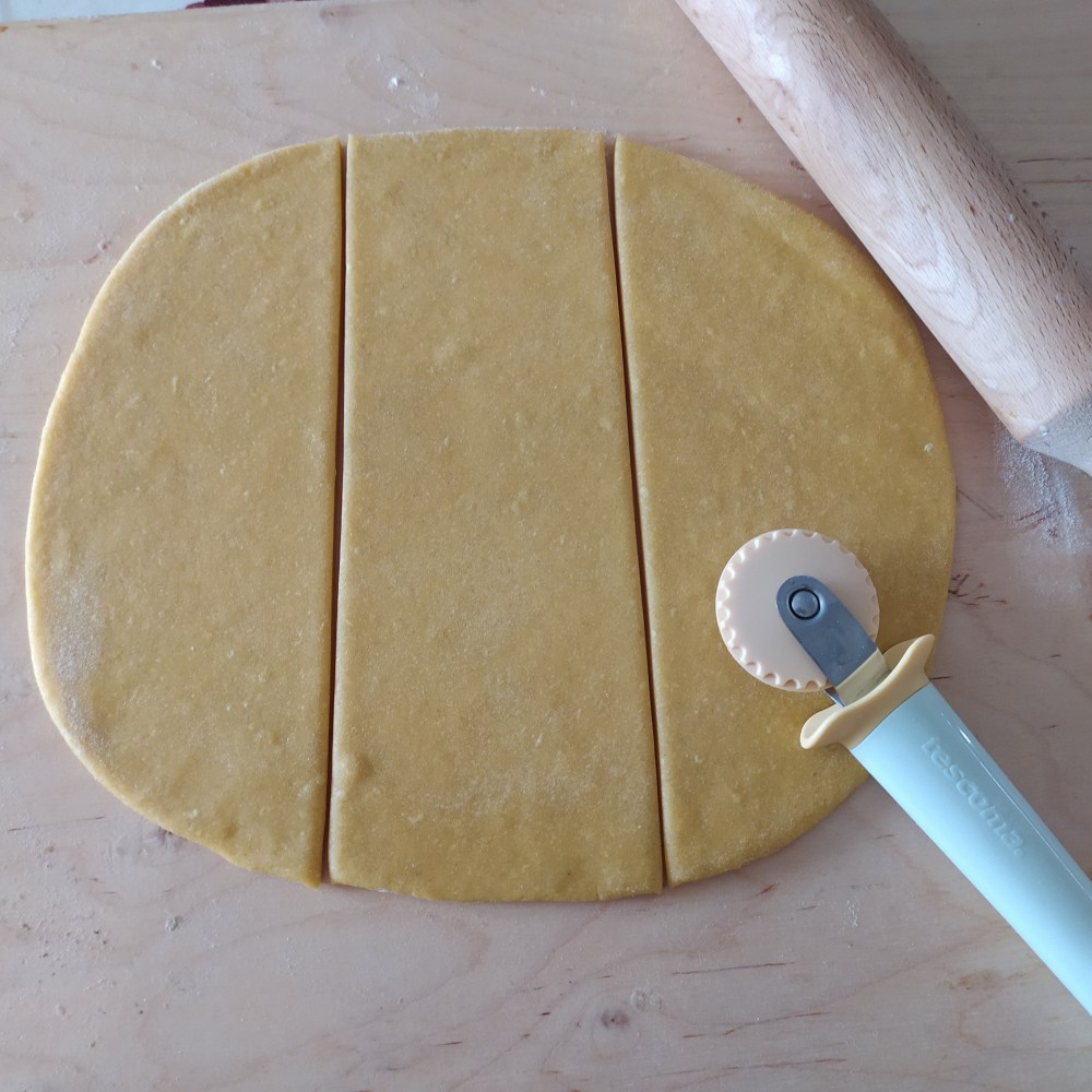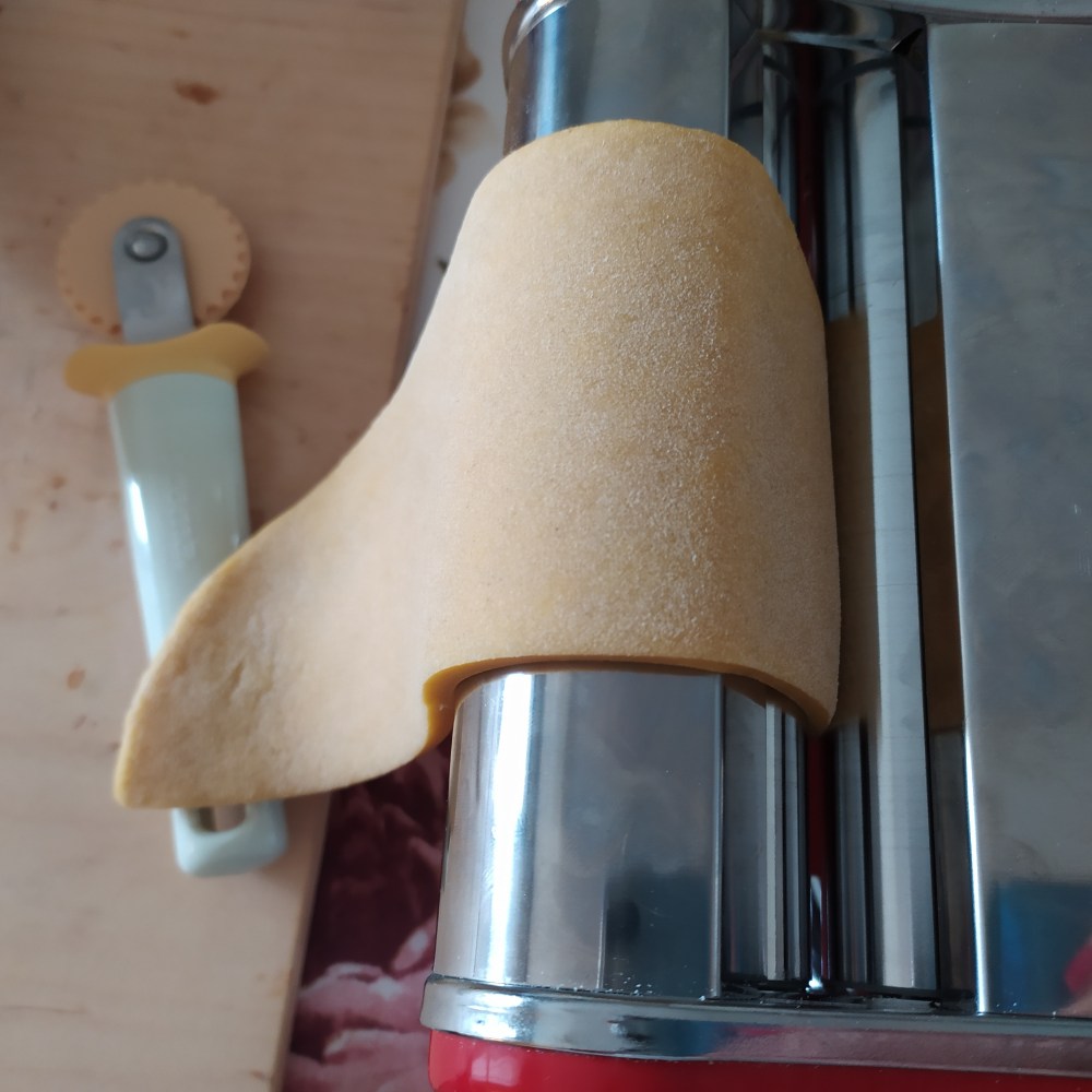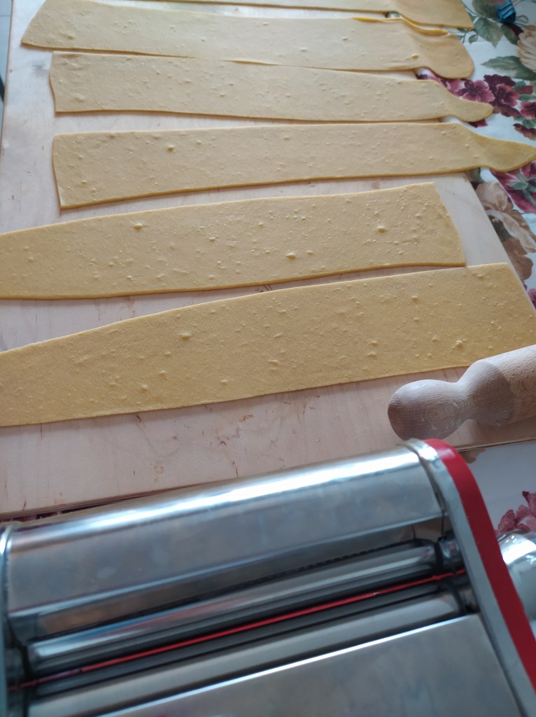 Di seguito le immagini delle sequenza per tirare la pasta con la macchina apposita. Consiglio, una volta raggiunto lo spessore desiderato, di coprire le singole strisce con pellicola o un canovaccio per non farle asciugare troppo o di tirarle poco per volta.