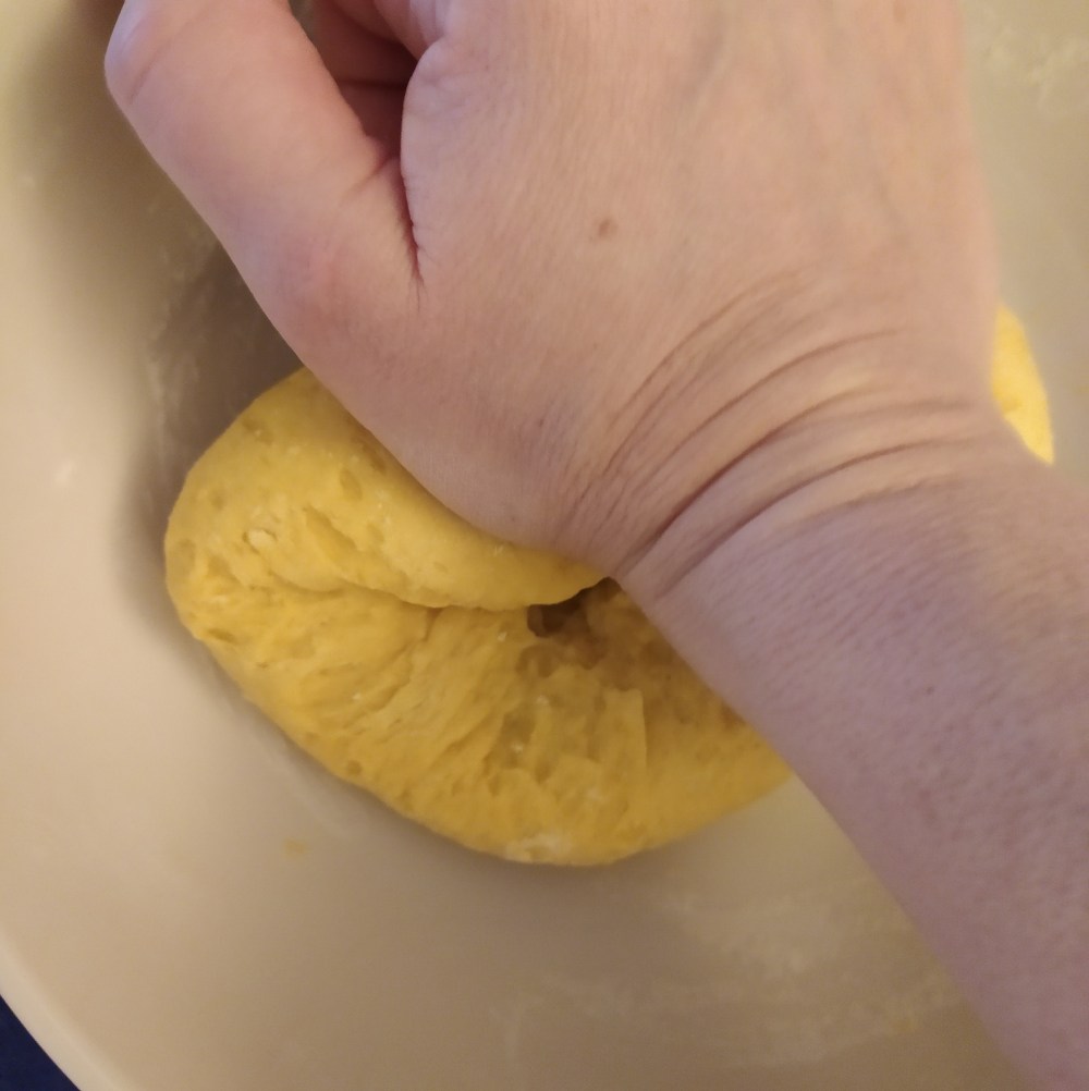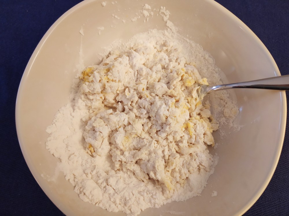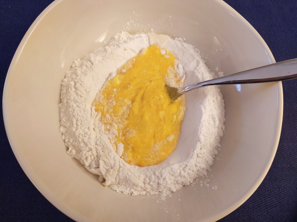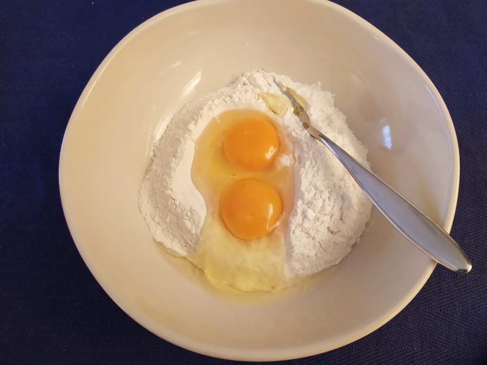 Per prima cosa prepariamo la pasta. In una terrina mettiamo la farina e le uova, sbattiamo le uova con una forchetta poi cominciamo ad impastare a mano prima dentro alla ciotola poi su un piano di lavoro o meglio ancora un tagliere da sfoglia. Occorre lavorare l’impasto almeno 10 minuti con i palmi della mano fino ad ottenere un impasto liscio ed omogeneo dalla forma circolare. Ricoprire con pellicola alimentare e mettere in frigorifero a riposare da un minimo di mezz’ora a qualche ora. In questo caso l’ho preparata alla sera per utilizzarla il mattino successivo.