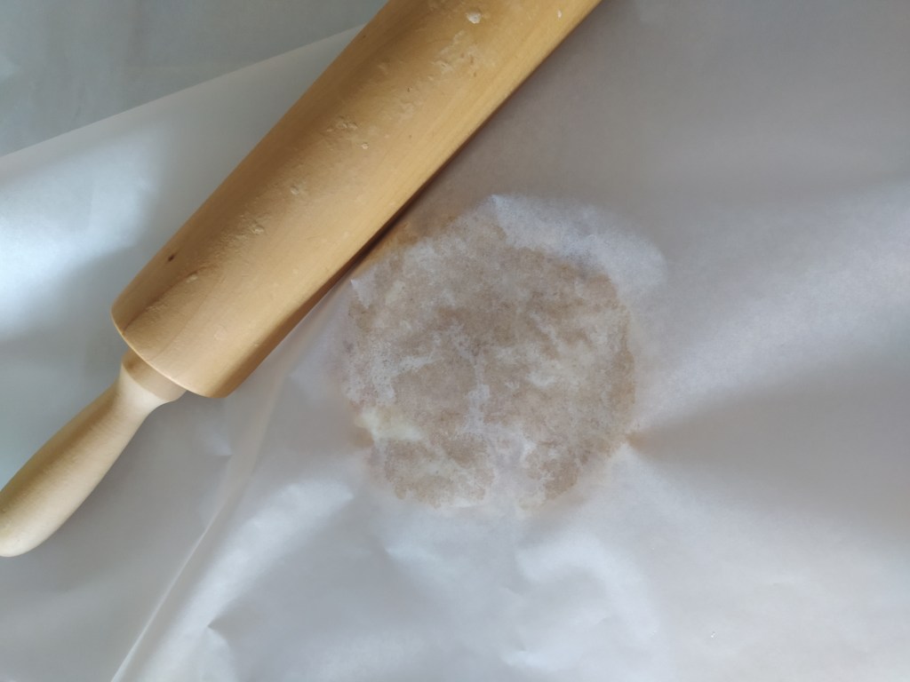 4_ Stendiamo la pasta tra due fogli di carta forno (abbastanza sottile) lasciando i bordi irregolari