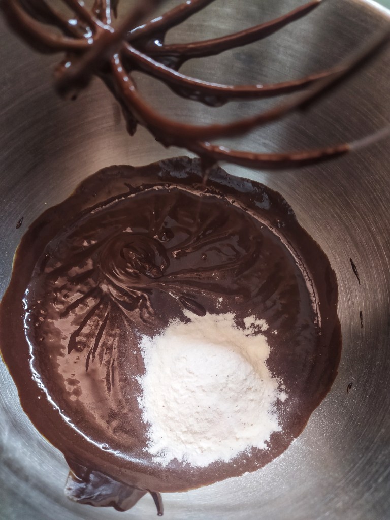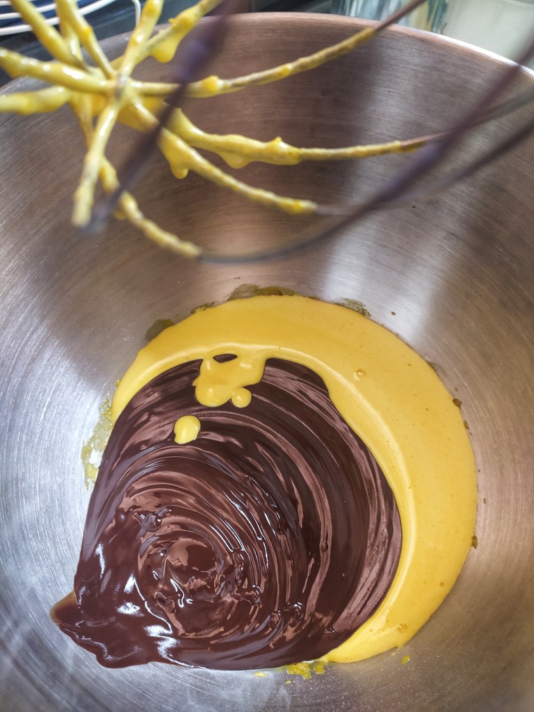 4_ Al composto di uova montate aggiungiamo il cioccolato e il burro precedentemente sciolti, l’importante è che non sia troppo caldo. Amalgamare bene.