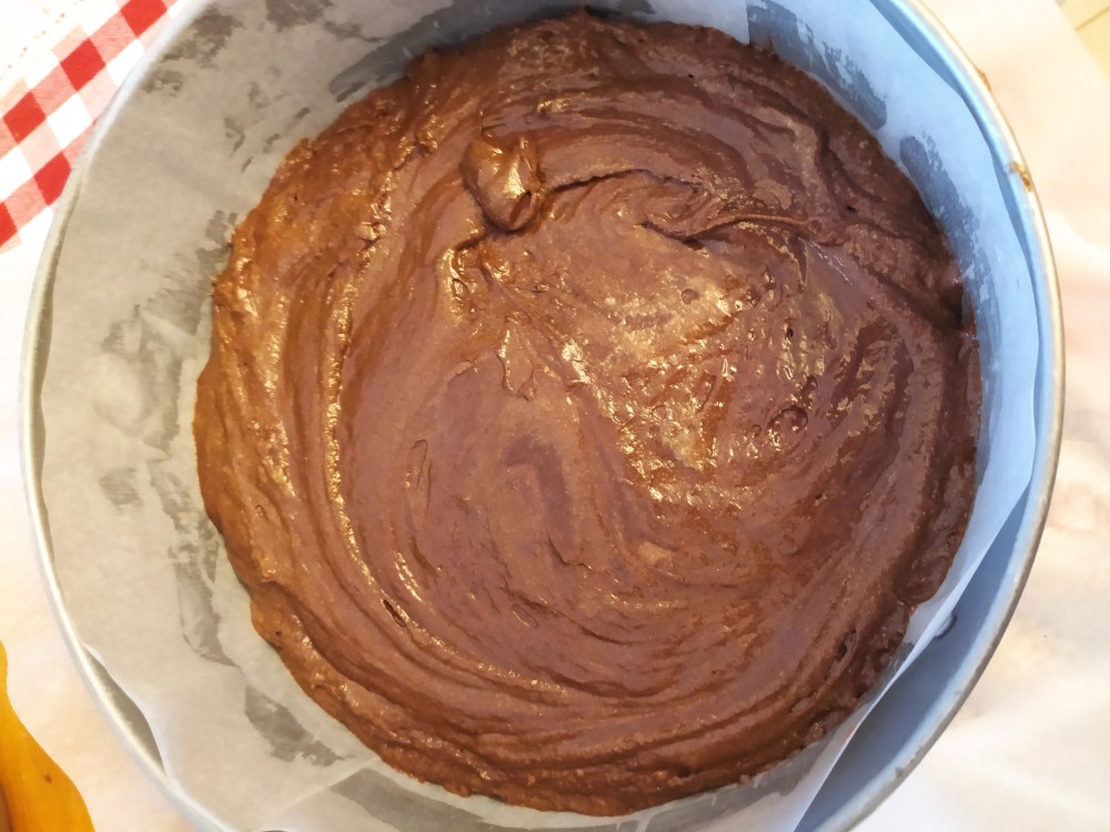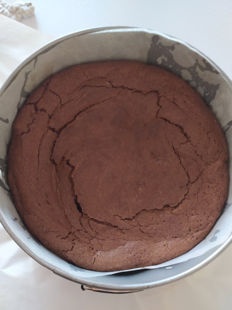 Rivestire la base e i bordi con carta forno. A forno caldo 180* per 25/30 minuti. Quando sulla superficie cominciano a formarsi alcune crepe, la torta sarà cotta.
