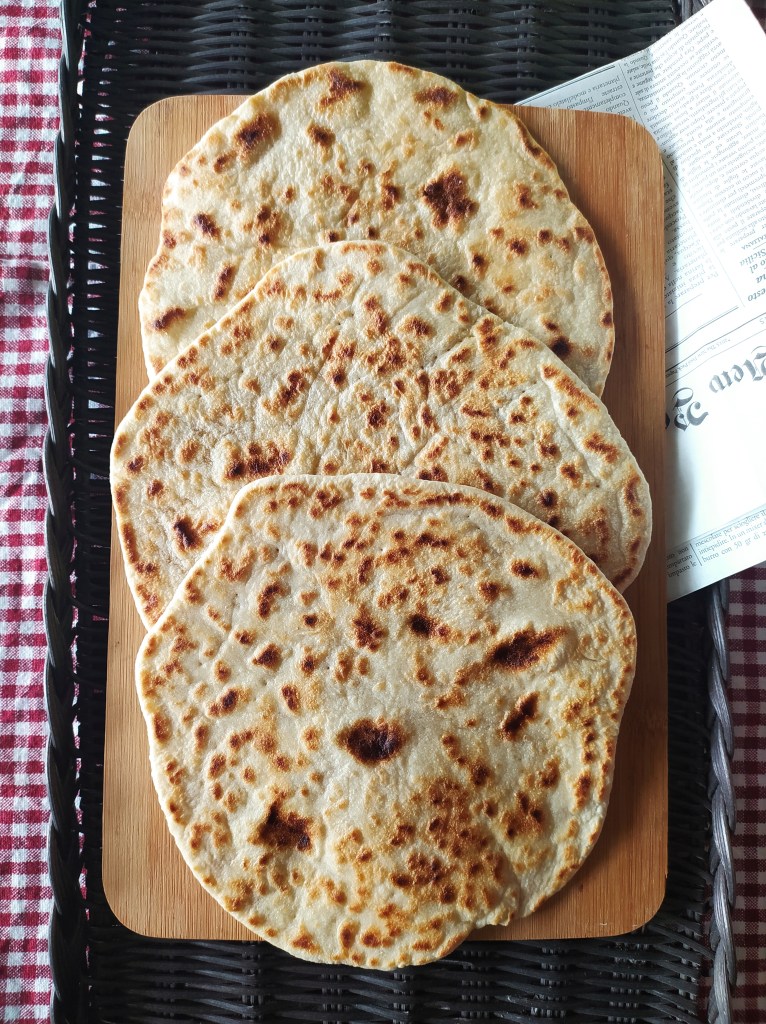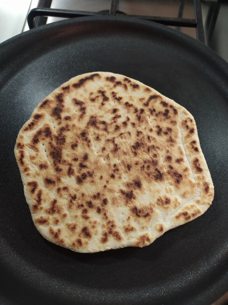 Una volta sulla piastra, bucherellate solo il lato superiore con una forchetta così da evitare eventuali bolle in cottura. Ruotarla su sè stessa alcune volte e poi girarla appena avrà assunto la colorazione tipica (vedi foto) .