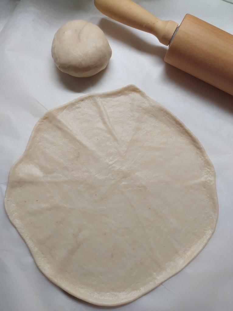 Riprendiamo l’impasto e impastiamo ancora direttamente nella ciotola. Vedrete che l‘impasto diventerà sempre più liscio ed omogeneo. Copriamo nuovamente e aspettiamo mezz’ora. A questo punto l’impasto è pronto. Formiamo circa 8 palline, le stendiamo col mattarello dello spessore di circa 4-5 mm. aiutandoci mettendo sotto un foglio di carta forno.