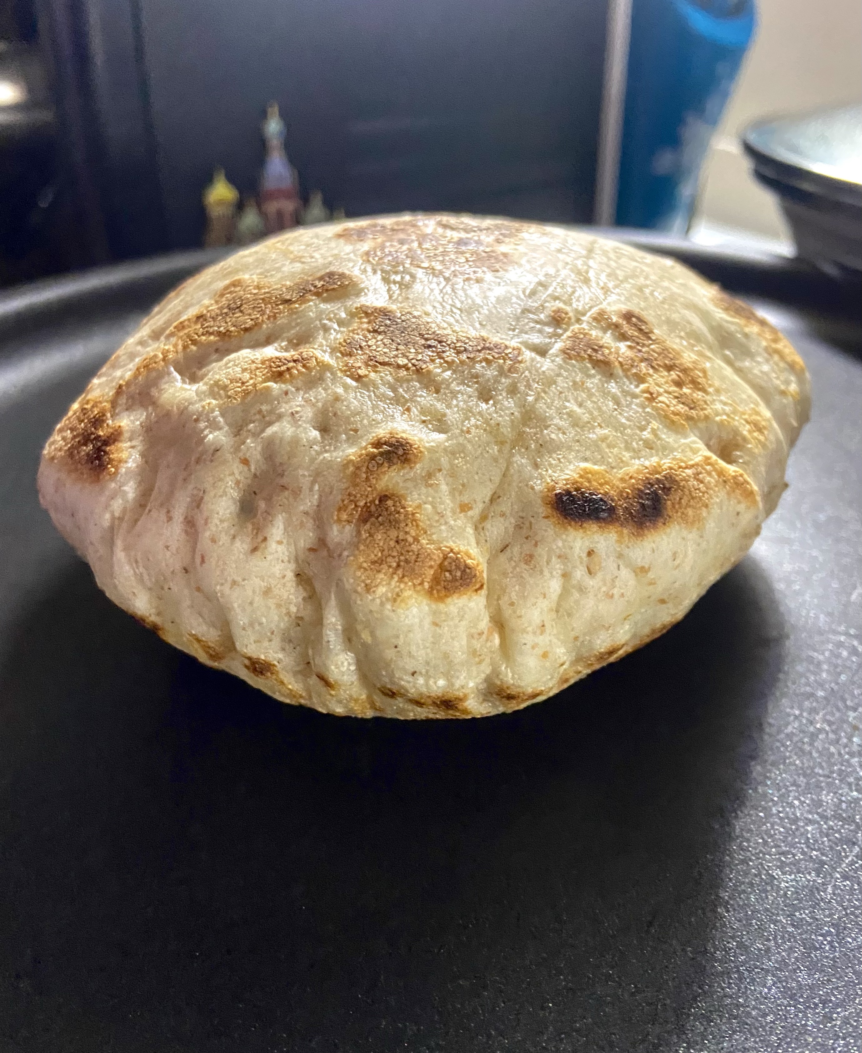 Formare circa 5/6 palline, scaldare una padella antiaderente e cominciare a stendere ogni pallina dello spessore di circa mezzo cm. Vedrete come si gonfieranno e saranno pronte per essere farcite come più preferite.